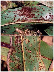 - మచ్చలన్నీ కలిసిపోయి పెద్ద మచ్చలుగా మారుతాయి. దానివల్ల ఆకు దెబ్బతిన్నట్టు కనపడుతుంది. ఆకుల మధ్య భాగంలో పొడవాటి, నలుపుతో కూడిన ఎరుపు లేదా ఊదా రంగు మచ్చలు కూడా కనపడతాయి. కాండం మీద గుండ్రటి గాయాల మాదిరి మచ్చలు ఉంటాయి.